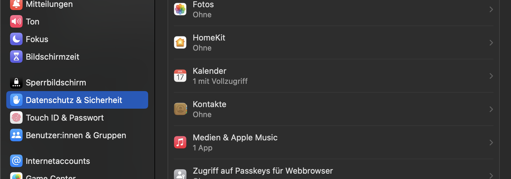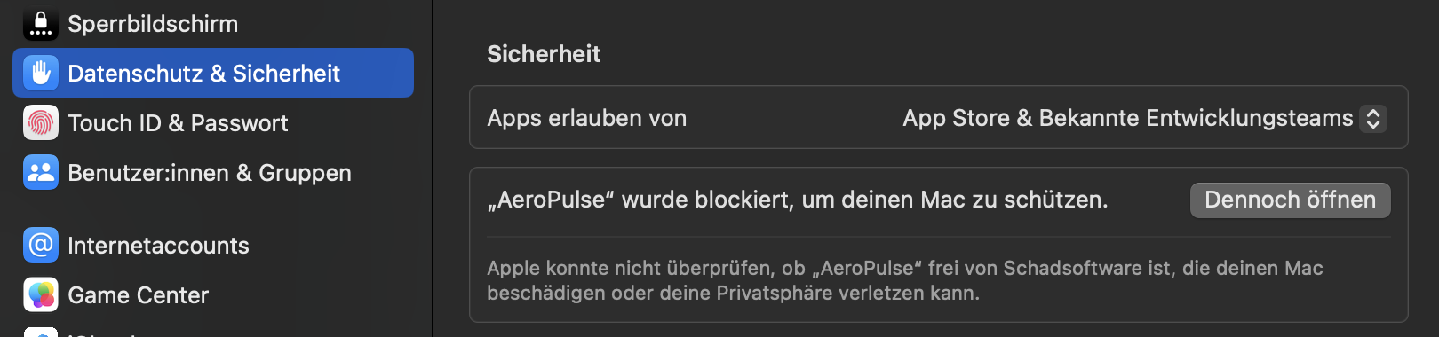Dann geht man in die Systemeinstellungen -> Datenschutz & Sicherheit und scrollt ganz nach unten.